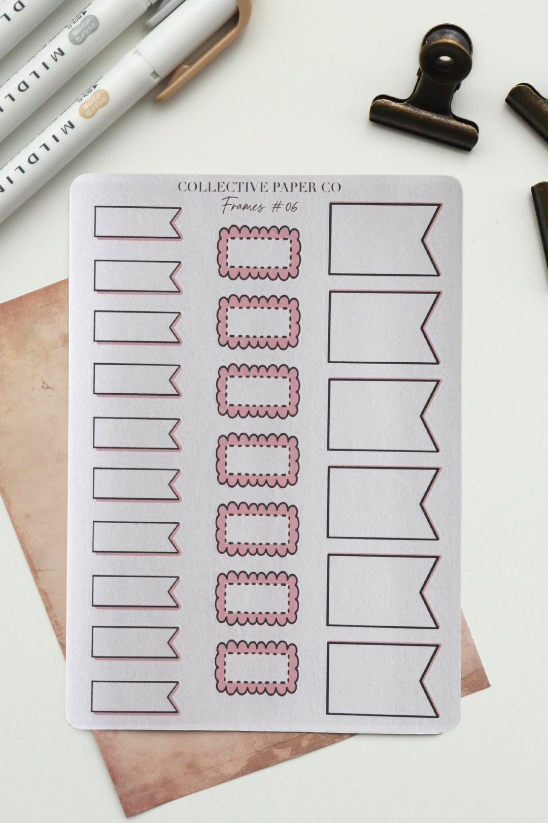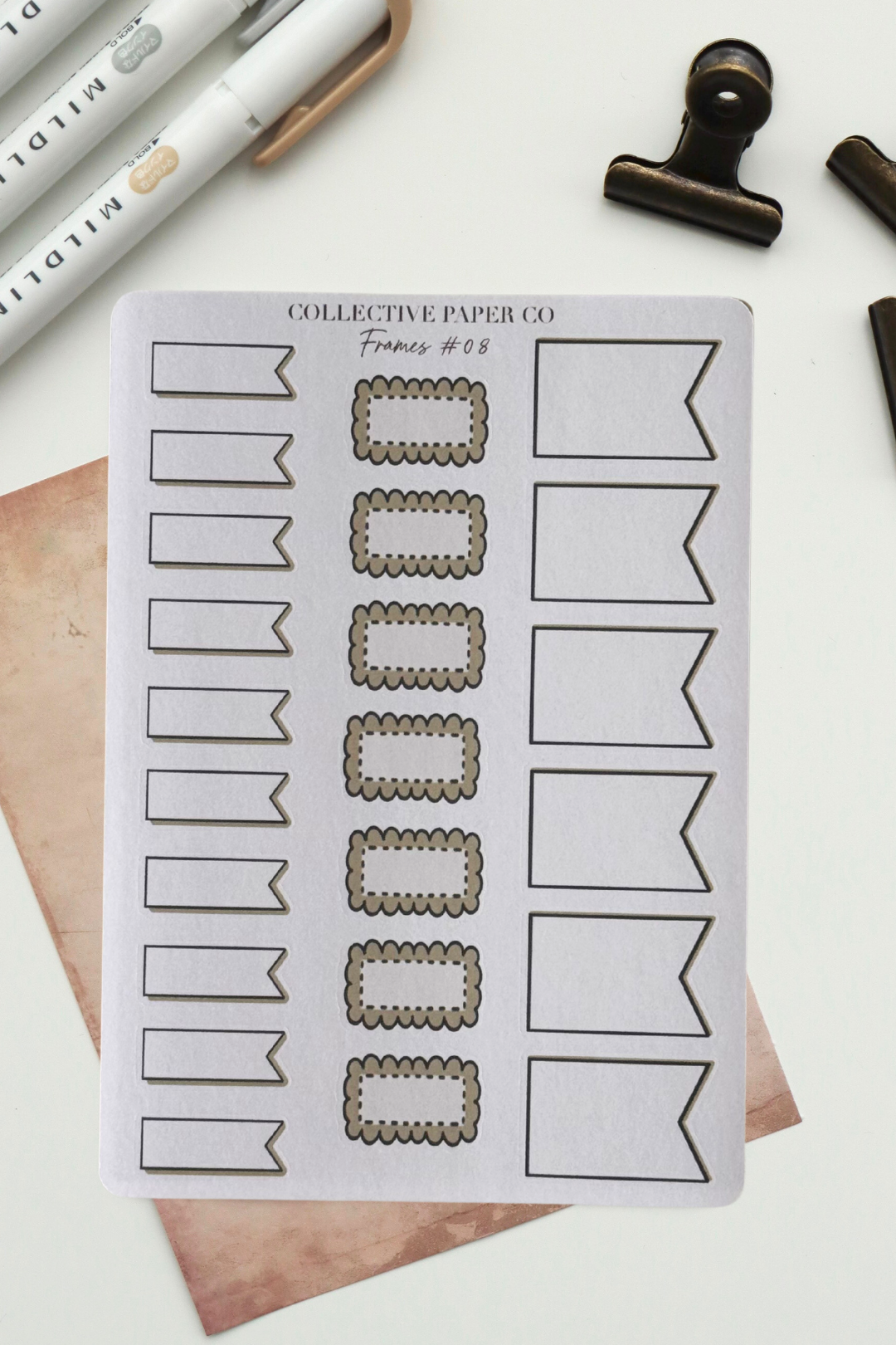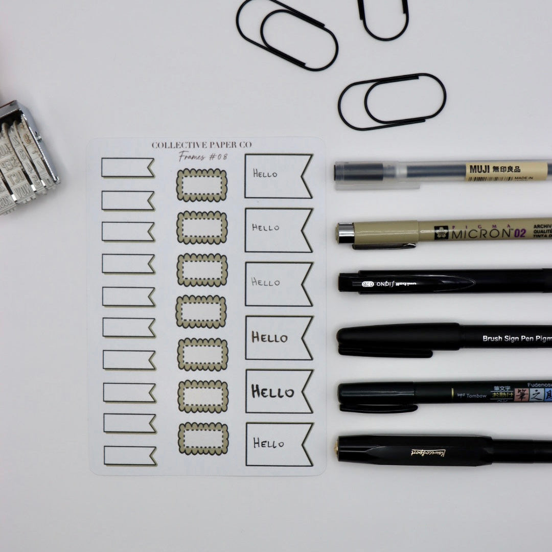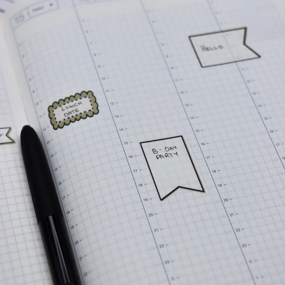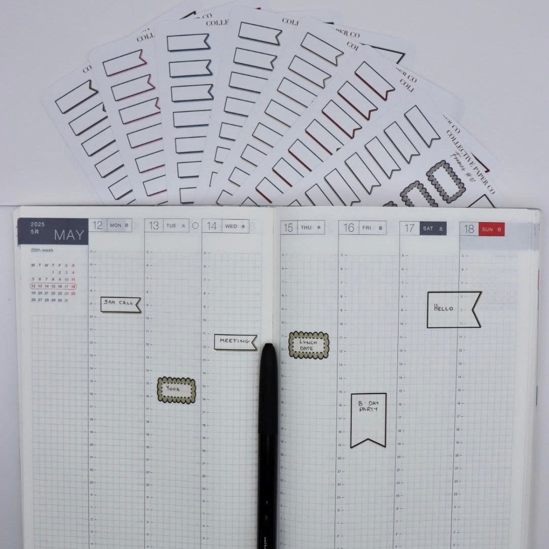 Frames and boxes that seamlessly integrate with your Hobonichi planner's weekly spreads. Each design accommodates the specific dimensions of your planner pages, allowing you to highlight key dates, goals, or notes with precision. The writable surface invites annotation and customisation, transforming your planning system into a dynamic, personalised tool.