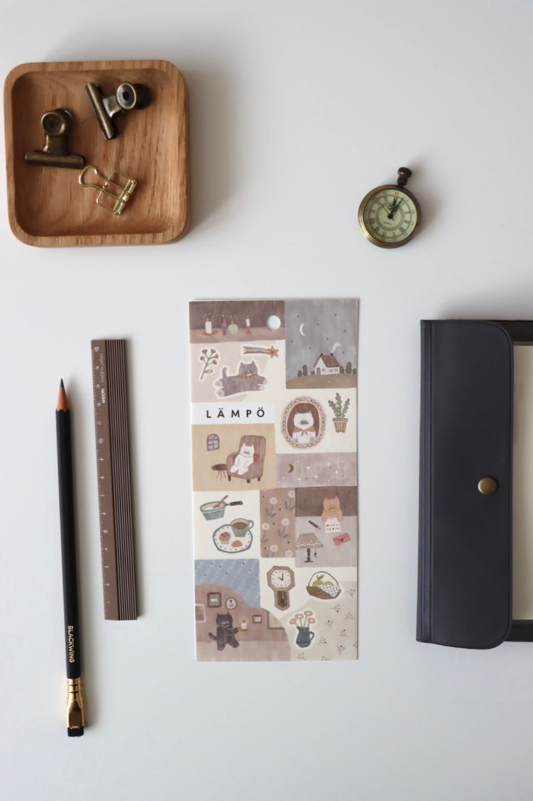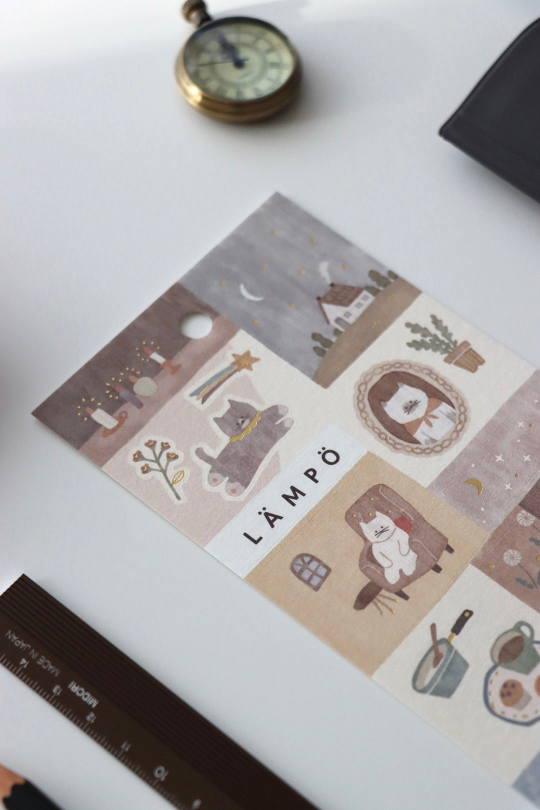 The Mind Wave LAMPO series features adorable animals in a gentle atmosphere. The illustrations are printed on matte paper and finished with a subtle gold foil. The small stickers are designed to be used on top of the larger stickers. Available in six different designs.