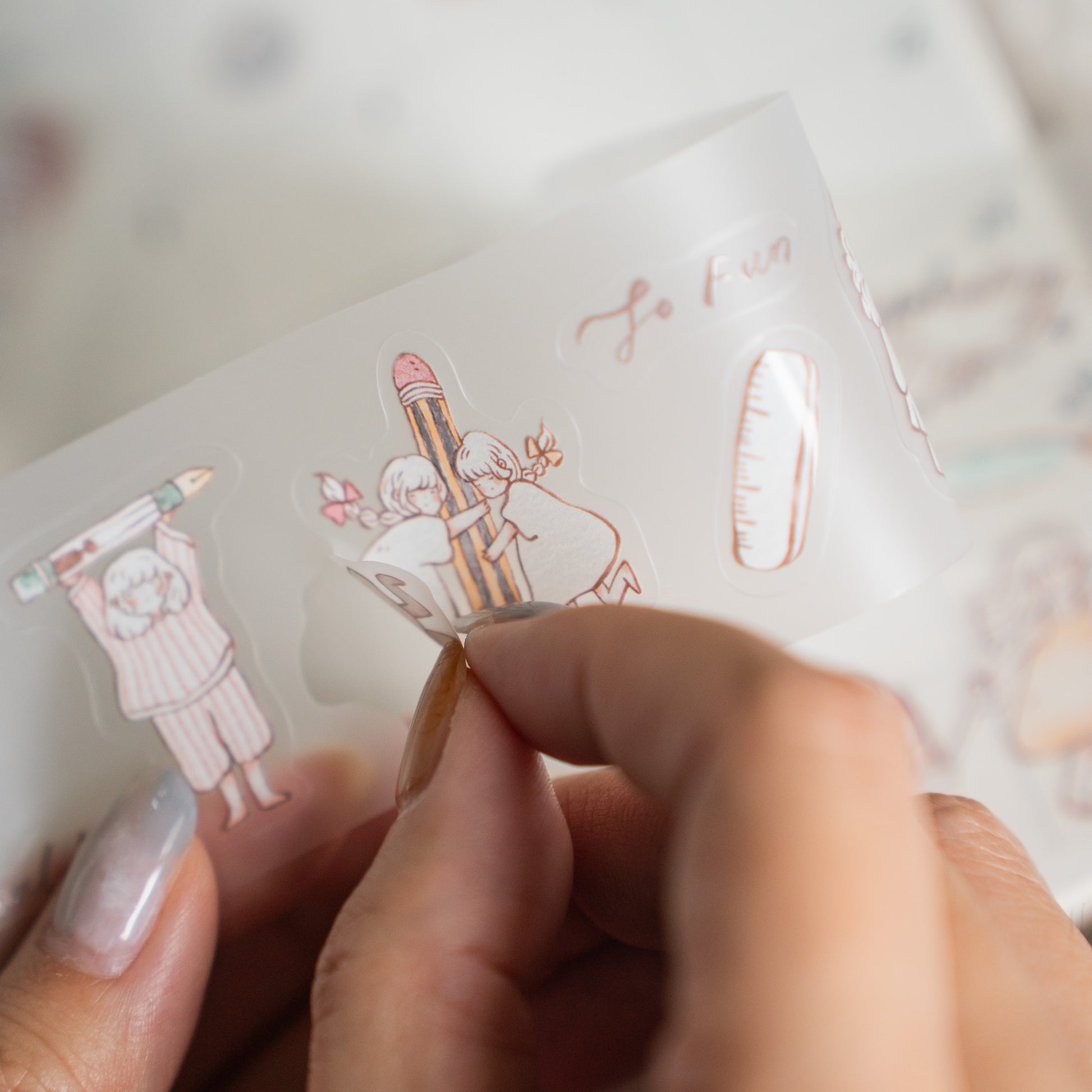 Elevate your stationery projects with Sho Little Happiness Kiss-Cut PET Tape, featuring meticulously illustrated stationery-themed characters in soft aesthetic. The transparent PET construction and precision kiss-cut design enable seamless application. Ideal for planners, journals, and/or scrapbooking - an essential addition for stationery enthusiasts seeking refined decorative solutions.